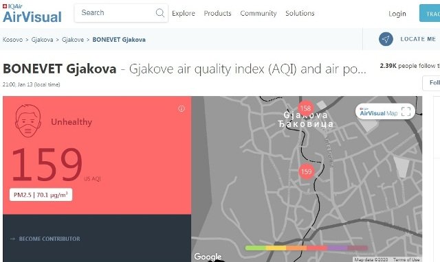 Në hapësirën krijuese Bonevet në Gjakovë është vendosur pajisja e matjes së ndotjes së ajrit . Arber Lleshi, udhëheqës I kësaj organizate, prej vikendit të fundit parametrat kanë pësuar një rritje shumë të madhe, sidomos të mbrëmjen e së shtunës, pasi kanë arritur që të kalojnë shifrën 400 të koeficientit, që është një parametër tepër i rrezikshëm, duke e bërë Gjakovës si ndër komunat më të ndotura në vend. Të hënën(sonte në orën 21.00 ), ky koficient është 159. Ky indeks paraqet nivelin e ndotjes dhe në këtë shkallë në Gjakovë aktualisht ka cilësi të ajrit të pashëndetshme.