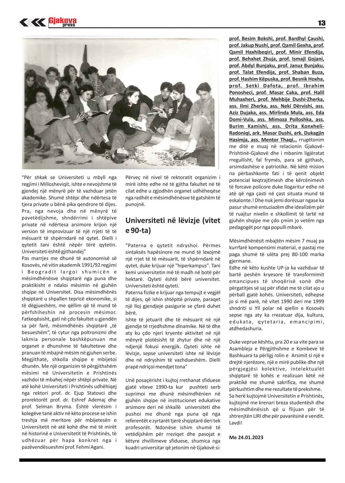 …. Unë posaçërisht i kujtoj rrethanat sfiduese gjatë viteve 1990-ta kur  pushteti serb suprimoi me dhunë mësimdhënien në gjuhën shqipe në institucionet edukative arsimore deri në shkallë  universiteti dhe pushoi me dhunë nga puna që nga referentët e zyrtarët tjerë shqiptarë deri të profesorët . Ndonëse ishim shumë të vetëdijshëm për rreziqet dhe pasojat e këtyre zhvillimeve sfiduese, shumica nga kuadri universitar që jetonim në Gjakovë si: prof. Besim Bokshi, prof. Bardhyl Çaushi, prof. Jakup Nushi, prof. Qamil Gexha, prof. Qamil Haxhibeqiri, prof. Minir Efendija, prof. Behxhet Zhuja, prof. Ismajl Gojani, prof. Abdyl Bunjaku, prof. Januz Bunjaku  prof. Talat Efendija, prof. Shaban Buza,prof. Hashim Kwpuska, prof. Besnik Hoxha, prof.Setki Dafota, prof. Ibrahim Ponosheci, prof. Masar Caka, prof. Halil Muhaxheri,prof. Mehbije Dushi-Zherka,ass. Ilmi Zherka, ass. Neki Dërvishi ass.Aziz Dujaka,ass. Mirlinda Mula, ass. Eda Domi-Vula,ass. Mimoza Polloshka,ass. Burim Kamishi, ass. Drita Konxheli-Radoniqi, ark. Masar Dushi, ark, Dukagjin Hasimja, ass. Mentor Thaqi… rrugëtonim me ditë e muaj  në relacionin Gjakovë-Prishtinë-Gjakovë  dhe i mbanim ligjëratat rregullisht, fal frymës, para së gjithash, arsimdashëse e patriotike. Në këtë mision na përbashkonte fati i të qenit objekt potencial keqtrajtimesh dhe kërcënimesh të forcave policore duke llogaritur edhe në atë  që nga çasti në çast situata mund të eskalonte.! Dhe nuk jemi dorëzuar ngase ka pasur shumë entuziazëm dhe idealizëm për të ruajtur nivelin e shkollimit të lartë në gjuhën shqipe me çdo çmim jo vetëm nga pedagoget por nga populli mbarë.