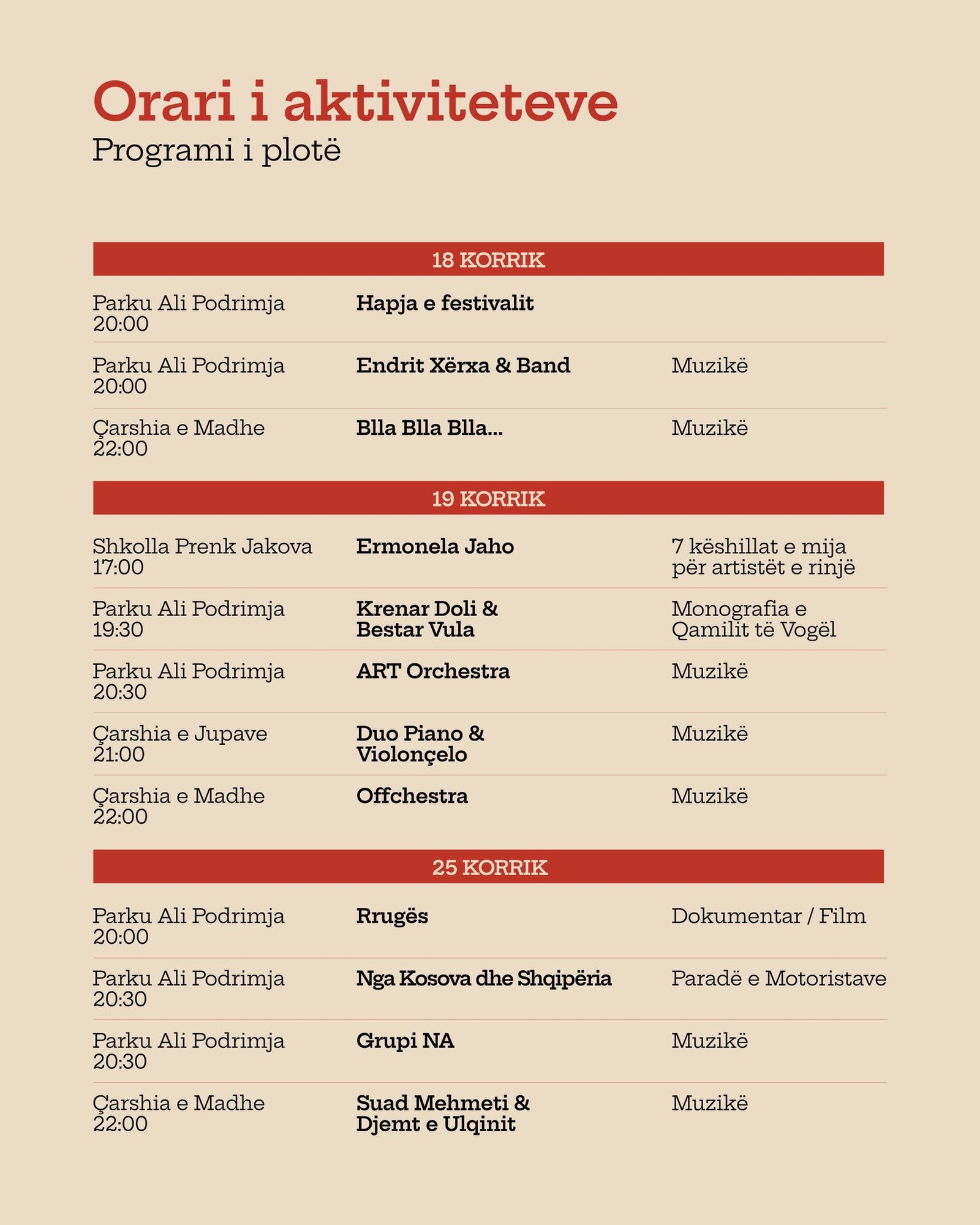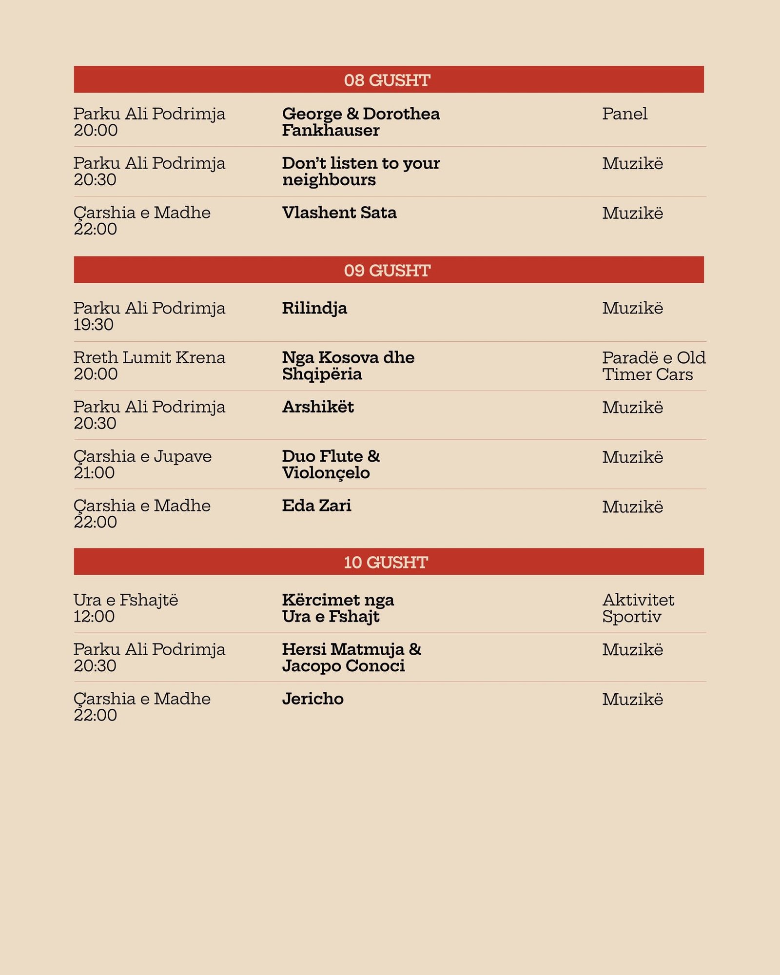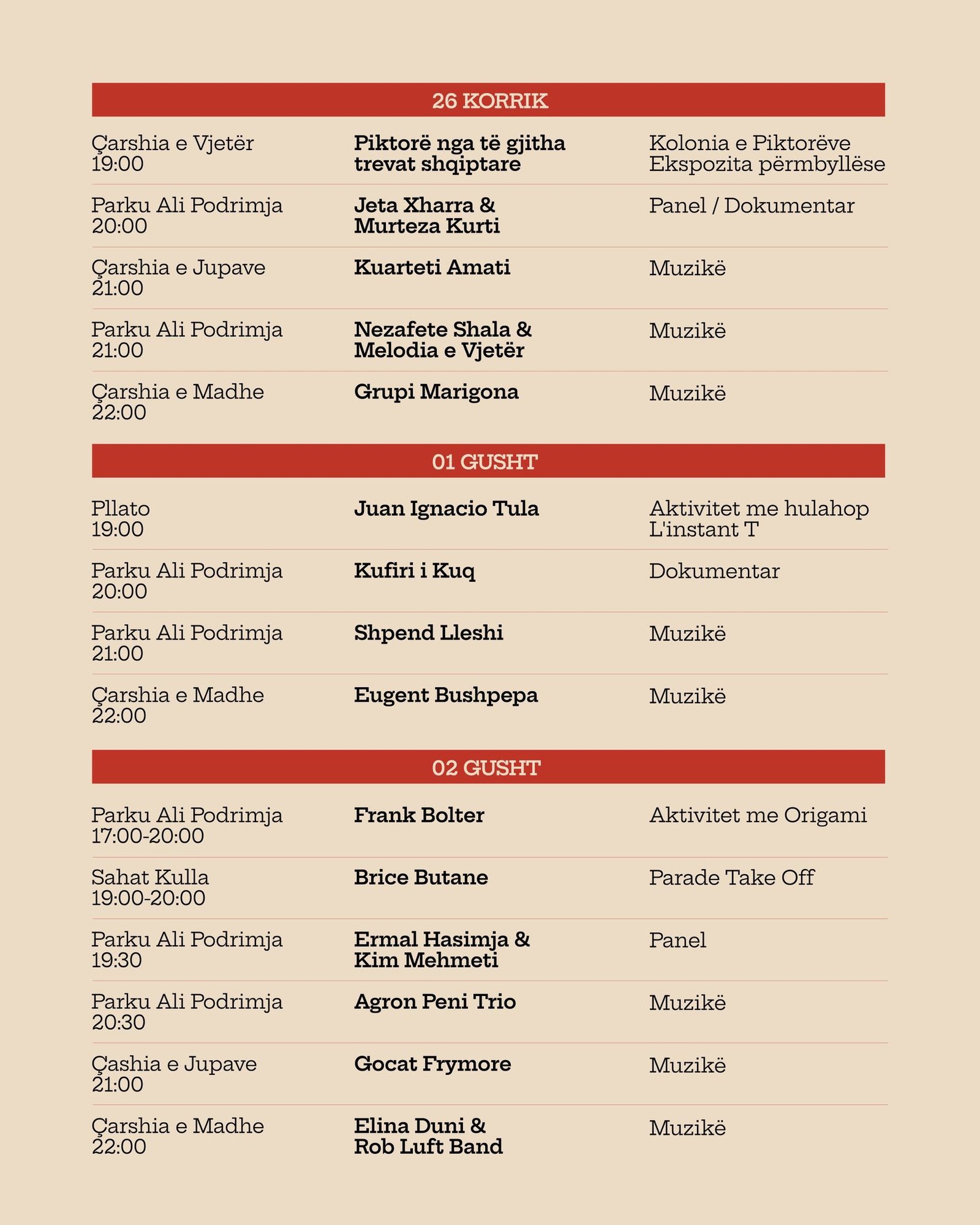 Ditët e Shqiptarit rikthehen fuqishëm për edicionin e dytë me 22 koncerte — muzikë me artistë t’përzgjedhun, aktivitete sportive, panele, gatime shqiptare e atmosferë të gjallë, që të bënë me shiju verën më ndryshe se kurrë. Të gjitha koncertet dhe aktivitetet e festivalit janë falas, pa rezervime dhe të hapura për të gjithë.