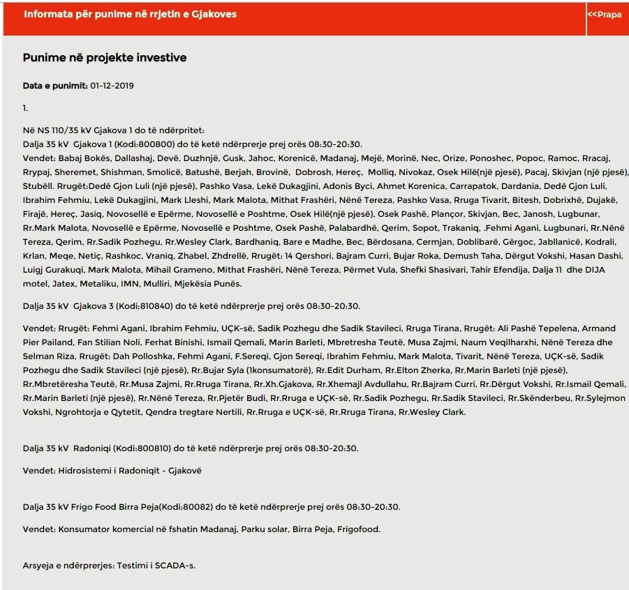 Nga faqja zyrtare e KEDS nxorëm informacionin zyrtar me rrugët dhe fshatrat që do të mbesin pa energji elektrike