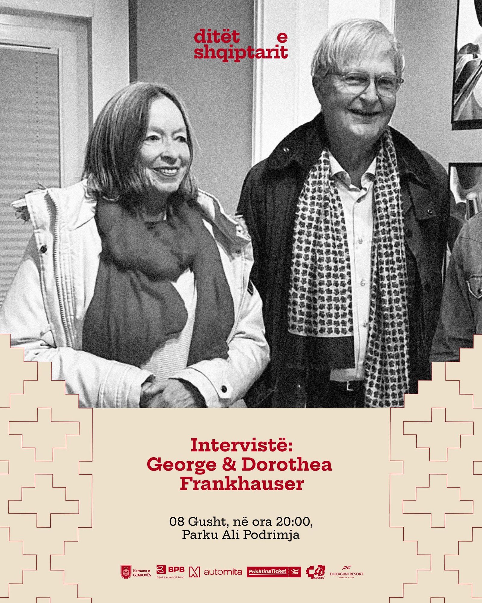 Të premten mbrëma nga ora 20.00 në parkun Ali Podrimja do të ketë një takim me George dhe Dorothea Fankhauser, themelues të fondacionit Pirolo në Bazel, që  njihen për përkushtimin e tyre afatgjatë në mbështetjen e muzikantëve të rinj shqiptarë, veçanërisht në Gjakovë, si dhe për organizimin e  aktiviteteve  kulturore e edukative që kanë lënë gjurmë ndër vite.