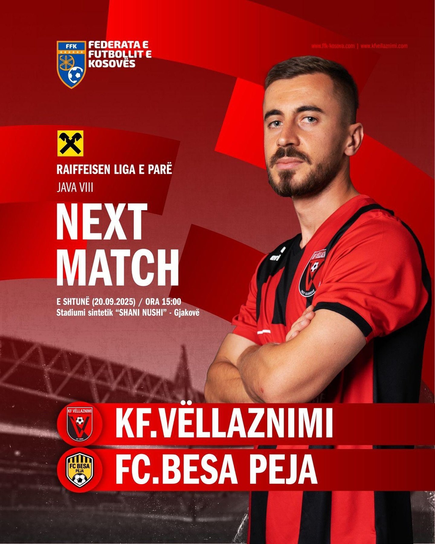 Futbolistët e Vëllaznimit në kuadër të javës së tetë të Raiffeisen Ligës së Parë, të shtunën prej ores 15.00 përballen me FC Besa nga Peja. Ndeshja luhet ne Gjakovë në stadiumin me bar sintetik te Pallati i sporteve Shani Nushi. Në mesjavë skuadra “Kuq e Zi”, ndau pikët me Trepca 89 në fushën e Malisheves për, siç u tha, mundësinë e transmetimit televiziv.