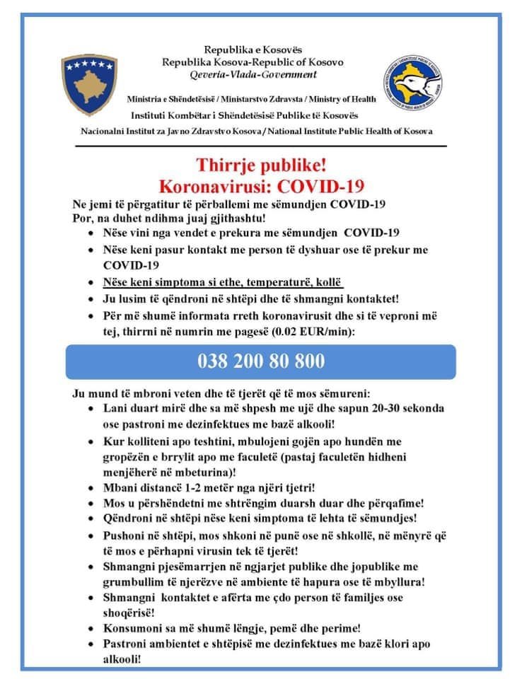 Sa më shumë t’ i përmbahemi rekomandimeve tē Institutit Kombëtar, Ministrisë së Shëndetësisë dhe masave te kompletuara të Qeverisë së Republikës së Kosovës aq më shpejt do ta shporrim COVID-19!