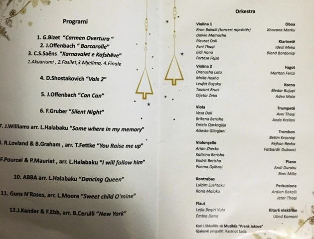 Ansambli Muzikor i Komunës së Gjakovës – Orkestra Simfonike, të shtunën mbrëma shfaqi Koncertin tradicional Festiv të Vitit të Ri 2020. Për mbi një orë program orkestra simfonike e përbërë prej 45 anëtarëve, solli para adhuruesve të muzikës , në Pallatin e Kulturës, në sallën e mbushur, ritme të popullarizuara të muzikës artistike. Koncerti filloi e mbaroi nën ritmet e veprës së G. Bizet “Carmen Overtura” dhe duartrokitjet e ngrohta që morën artistët në skenë. Nën dirigjimin e Pëllumb Vulës, ky orkestër solli para artdashësve pjesë nga muzika vieneze e fundvitit, ndërkohë që pjesë e kësaj mbrëmje muzikore ishte edhe kori I Shkollës së Muzikës “Prenk Jakova”.
