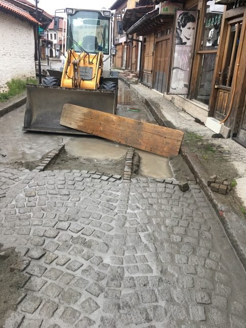 Në anën tjetër kalldrëmi me kocka, pasi më parë është ndërtuar infrastruktura dhe është shtrirë me beton,  në disa rrugë veç ka filluar të vendoset siç shihet në foto. Komuna po thotë se do ti shtrojë kështu të gjitha rrugët e Çarshisë.