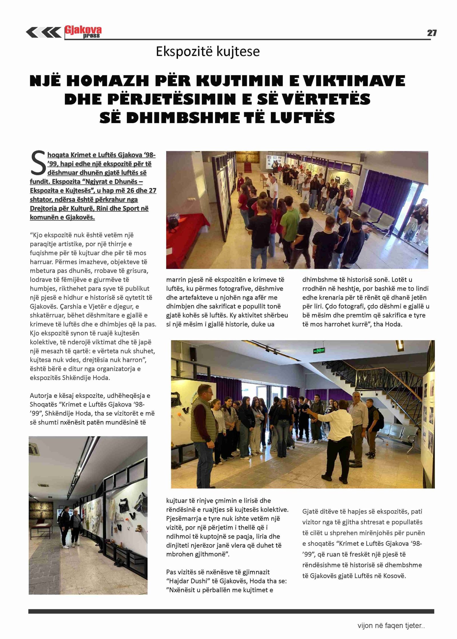 Shoqata Krimet e Luftës Gjakova 98’-99’, hapi edhe një ekspozitë për të dëshmuar dhunën gjatë luftës së fundit. Ekspozita “Ngjyrat e Dhunës – Ekspozita e Kujtesës”, u hap më 26 dhe 27 shtator, ndërsa është përkrahur nga Drejtoria për Kulturë në komunën e Gjakovës….