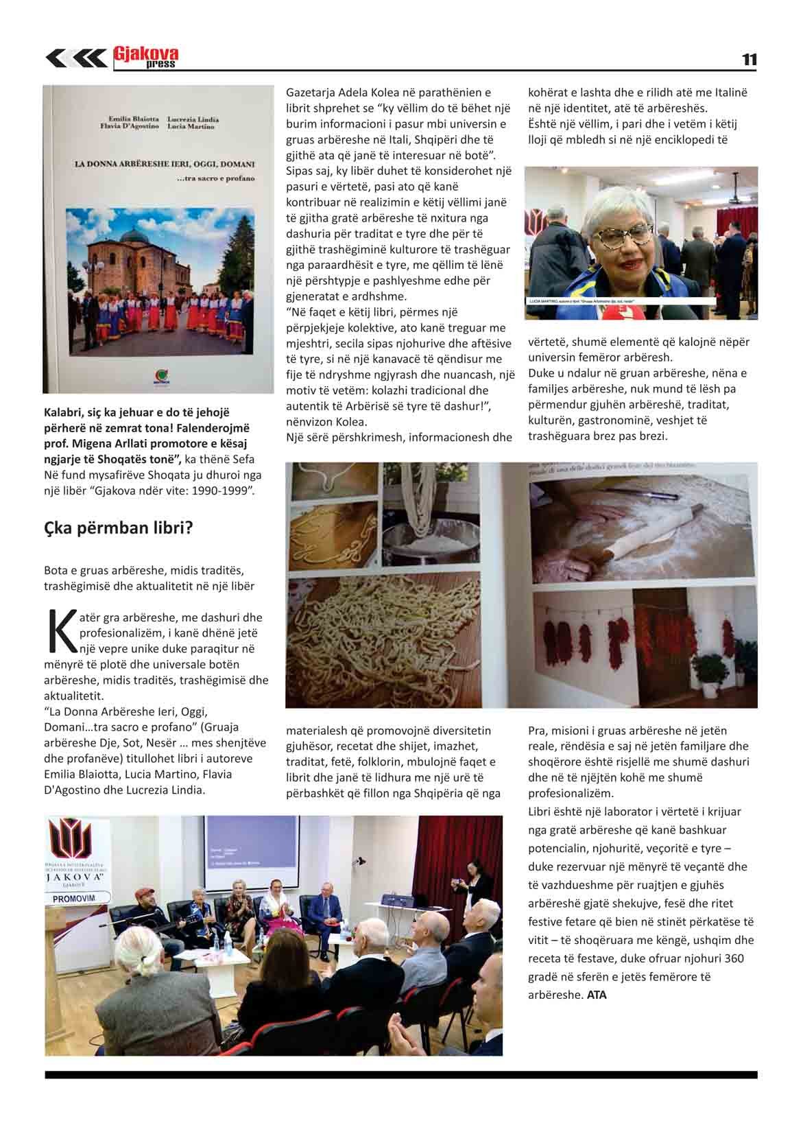 Me iniciativë dhe mbështetje nga Shoqata e Intelektualëve “Jakova”, në Gjakovë është organizuar promovimi i librit me titull “Gruaja Arbëreshe dje, sot dhe nesër”, shkruar nga katër gra arbëreshe. Për brendinë dhe veçoritë e këtij libri, Luqia Martino, njëra nga autoret e këtij libri, ka thënë se libri, më së shumti i dedikohet të rinjve për të dëshmuar dhe dokumentuar se arbëreshet janë akoma gjallë, ata jetojnë në përpjekje për të mos harruar kur rrënjët e tyre.