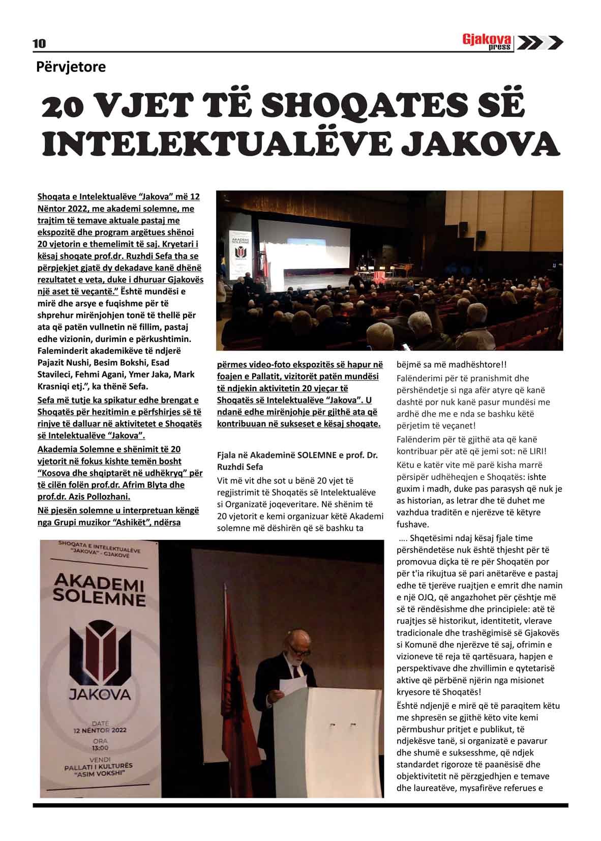 Shoqata e Intelektualëve “Jakova” me akademi solemne, me trajtim të temave aktuale pastaj me ekspozitë dhe program argëtues shënoi 20 vjetorin e themelimit të saj. Kryetari i kësaj shoqate prof.dr Ruzhdi Sefa tha se përpjekjet gjatë dy dekadave kanë dhënë rezultatet e veta, duke i dhuruar Gjakovës një aset të veçantë.” Është mundësi e mirë dhe arsye e fuqishme për të shprehur mirënjohjen tonë të thellë për ata që patën vullnetin në fillim, pastaj edhe vizionin, durimin e përkushtimin. Faleminderit akademikëve të ndjerë Pajazit Nushi, Besim Bokshi, Esad Stavileci, Fehmi Agani, Ymer Jaka, Mark Krasniqi etj.”, ka thënë Sefa .