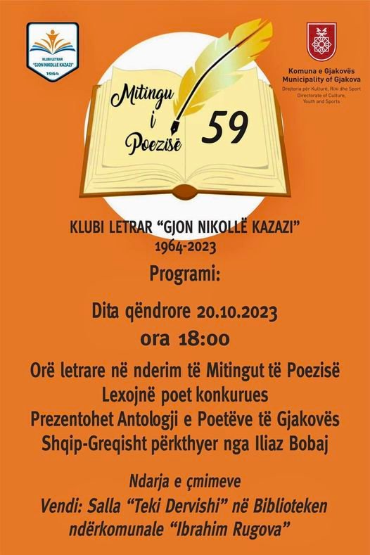 Nuk është thënë kot për Gjakovën se është qytet i poetëve e shkrimtarëve. Që 59 vjet këtu mbahet Mitingu i Poezisë. Për këto gati 6 dekada nëpër këtë aktivitet unik të krijimtarisë letrare, kanë kaluar emra të shquar të letërsisë kombëtare por edhe ndërkombëtare. Sivjet, ndonëse në format me të vogël krahasuar me vitet e shkuara, në klubin letrar “Gjon Nikollë Kazazi” si organizator, janë angazhuar që ky manifestim letrarë me sukses të vazhdoj traditën e nisur para gjashtë dekadave. Pikërisht nismëtarëve të Mitingut dhe atyre që vazhduan më pas që ky aktivitet të bëhet organizimi më i madh letrarë në vend, do ti kushtohet ora letrare. Po ashtu gjatë mitingut do të prezantohet Antologjia së poetëve të Gjakovës” në shqip e greqisht e përkthyer nga poeti nga Shqipëria, Iljaz Bobaj.