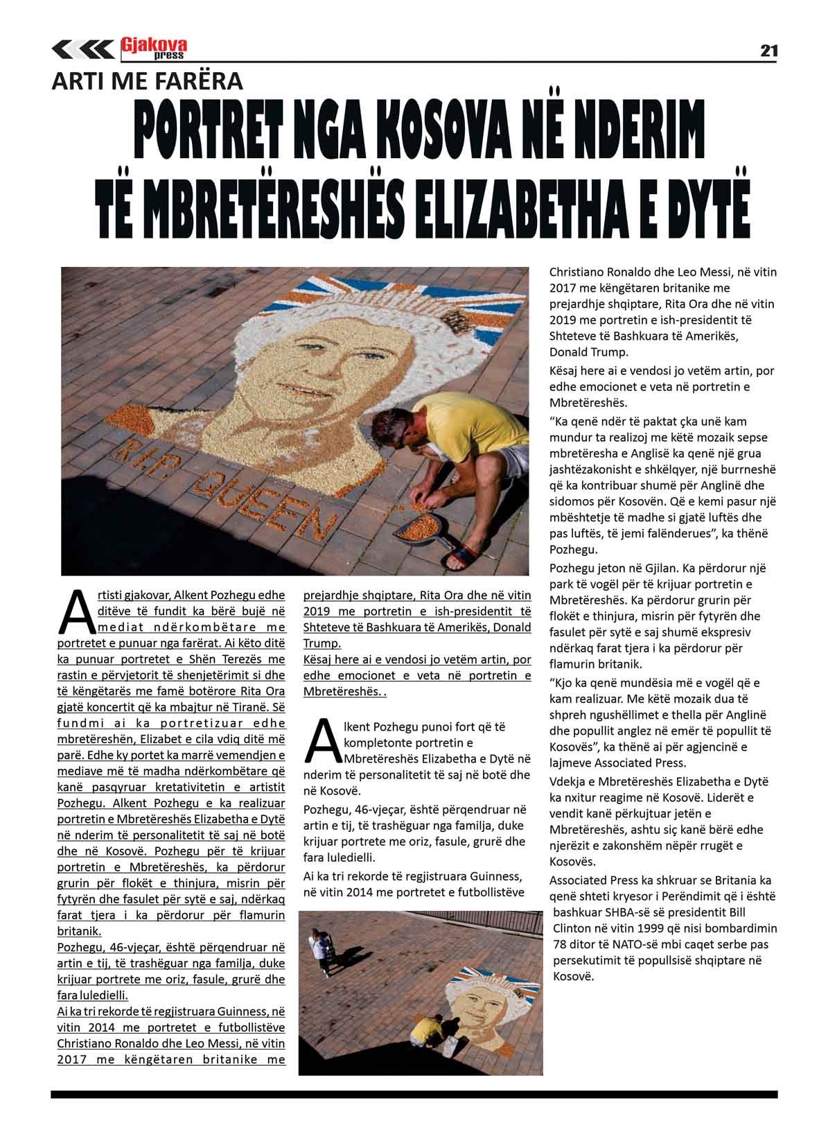 Artisti gjakovar, Alkent Pozhegu edhe  ditëve të fundit   ka bërë bujë  në mediat ndërkombetare me portretet e punuar nga farërat. Ai këto ditë ka punuar portretet e Shën Terezës me rastin e përvjetorit të shenjetërimit  si dhe të këngëtarës me famë botërore Rita Ora gjatë koncerit që ka mbajtur në Tiranë. Së fundi ai ka portretizuar edhe mbretrëshën, Elizabet e cila vdiq ditë më parë. Edhe ky portet ka marrë vemendjen e mediave më të madha ndërkombëtare që kanë pasqyruar kretativitetin e artistit Pozhegu. Alkent Pozhegu e ka realizuar portretin e Mbretëreshës Elizabetha e Dytë në nderim të personalitetit të saj në botë dhe në Kosovë. Pozhegu për të krijuar portretin e Mbretëreshës, ka përdorur grurin për flokët e thinjura, misrin për fytyrën dhe fasulet për sytë e saj, ndërkaq farat tjera i ka përdorur për flamurin britanik.