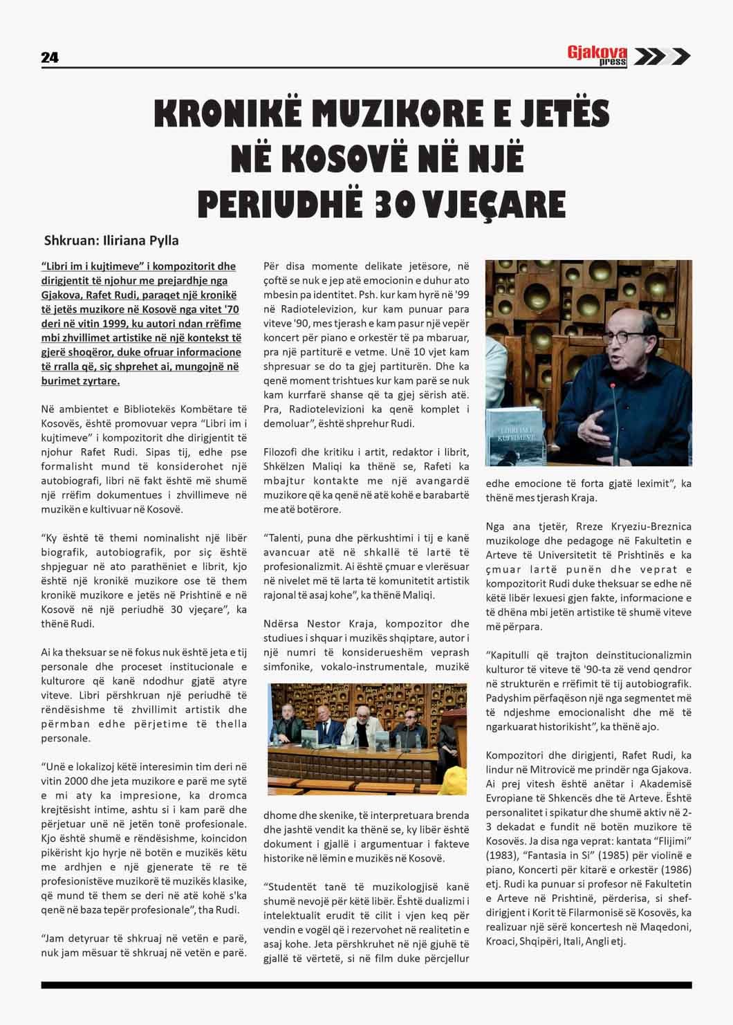 “Libri im i kujtimeve” i kompozitorit dhe dirigjentit të njohur me prejardhje nga Gjakova, Rafet Rudi, paraqet një kronikë të jetës muzikore në Kosovë nga vitet ’70 deri në vitin 1999, ku autori ndan rrëfime mbi zhvillimet artistike në një kontekst të gjerë shoqëror, duke ofruar informacione të rralla që, siç shprehet ai, mungojnë në burimet zyrtare.