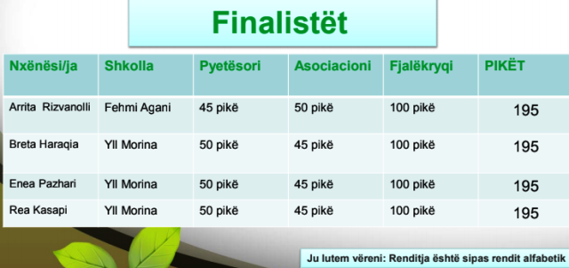 Rezultatet finale u publikuan sot . Tri nxënëset e Yll Morines, : Breta Haraqia, Enea Pazhari dhe Rea Kasapi bashkë me Arrita Rizvanolli ,nxënësja e shkolles Fehmi Agani u shpallen më të mirat me nga 195 poenë