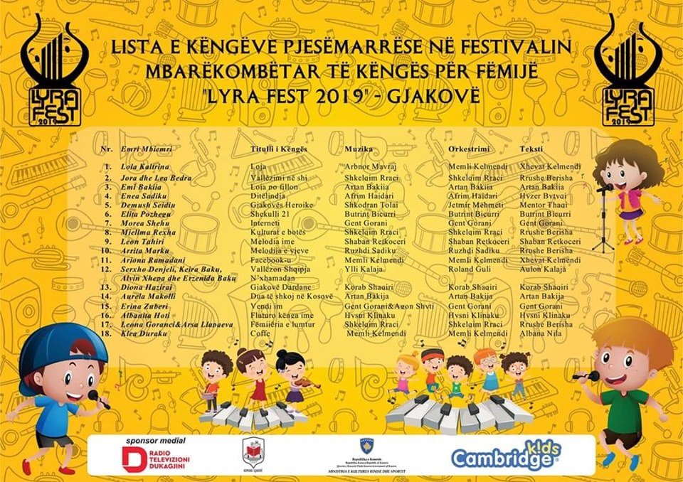 Në Pallatin e Kultures Asim Vokshi, të shtunën në mbrëmje, jehuan zërat fëmijëror nga festivali i këngës për fëmijë Lyra Fest 2019. U prezantuan 18 këngë të reja nga fëmijë të talentuar dhe autor këngësh tash më të njohur në skenën muzikore mbarë shqiptare. Organizatori ndau çmimet tradicionale.