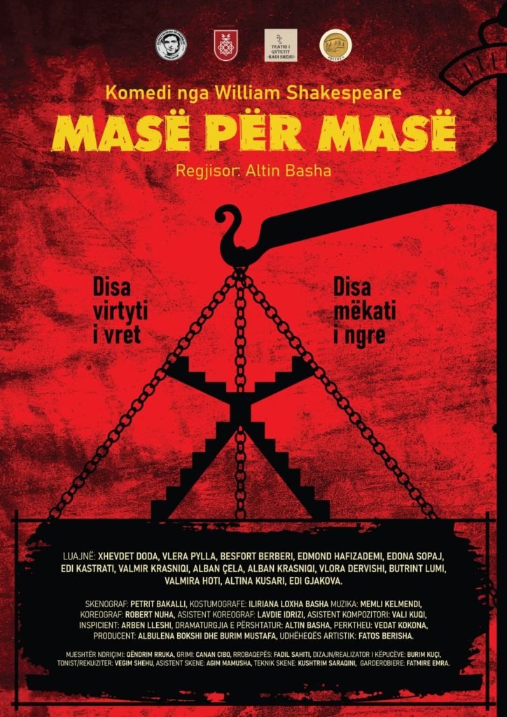 Drama “Masë për masë” me skenografi të Petrit Bakallit, kostumografi të Ilirjana Loxha Bashës, muzikë nga Memli Kelmendi dhe koreografi të Robert Nuhes, korrespondon me gjendjen aktuale të shoqërisë. Kjo do të jetë shfaqja e dytë premierë e teatrit “Hadi Shehu” për sivjet.